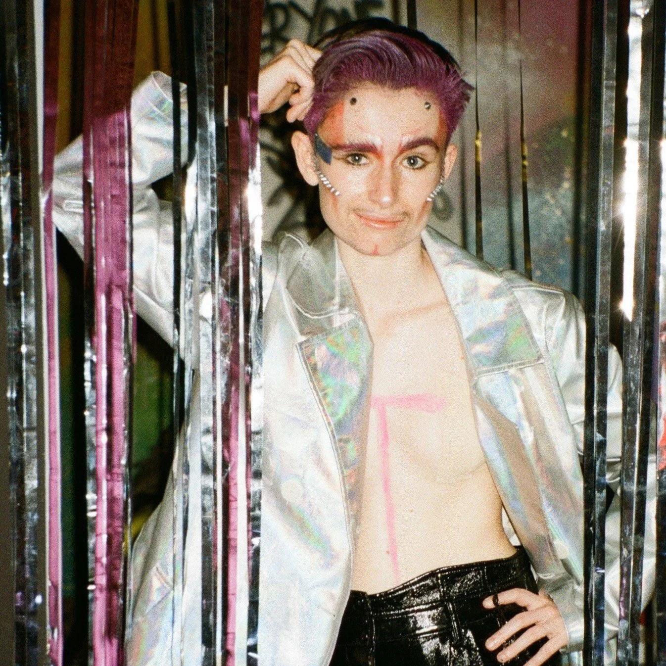 Ding Frisby is an intergalactic, guitar-wielding drag thing writing songs for queer aliens everywhere. Described as "Bowie meets Victoria Wood," they’ve performed their glam-punk anthems and comedy songs across the nation, from opening for Ginny Lemon, to the grand final of Europe's biggest drag king contest, Man Up. Originally crash landed in Huddersfield, Ding’s passionate about local queer community and has hosted Out + Loud queer open mic since 2019.